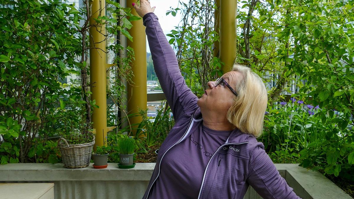 Oben auf dem Dach läuft die Seniorin zu den jungen Eichen und Ahornbäumen. Vögel mit rotem Köpfchen flattern um die Baumwipfel. Plötzlich schiesst einer der Distelfinken über die Dachkante in die Tiefe. Heidy Schumpf eilt ans Geländer, blickt dem Vogel nach und ruft: «Sturzfluuug.» Dann lacht sie und widmet sich dem Unkraut in den Trögen.